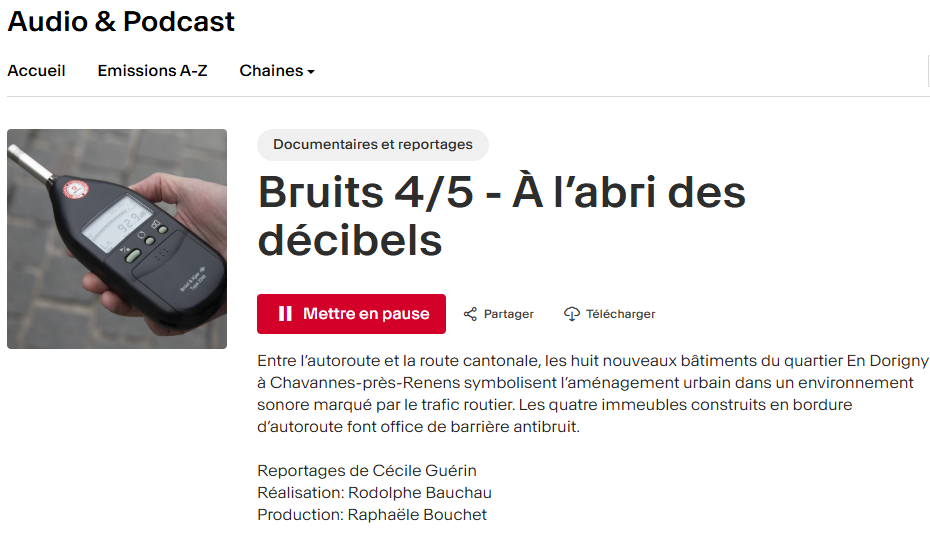 Cette semaine, l’émission Vacarme de la RTS se penche sur la question du bruit. Notre collègue Dimitri Magnin a été interviewé sur cette thématique, notamment dans l’épisode 4 qui traite du Quartier Horizons (en Dorigny) à Chavannes-près-Renens.